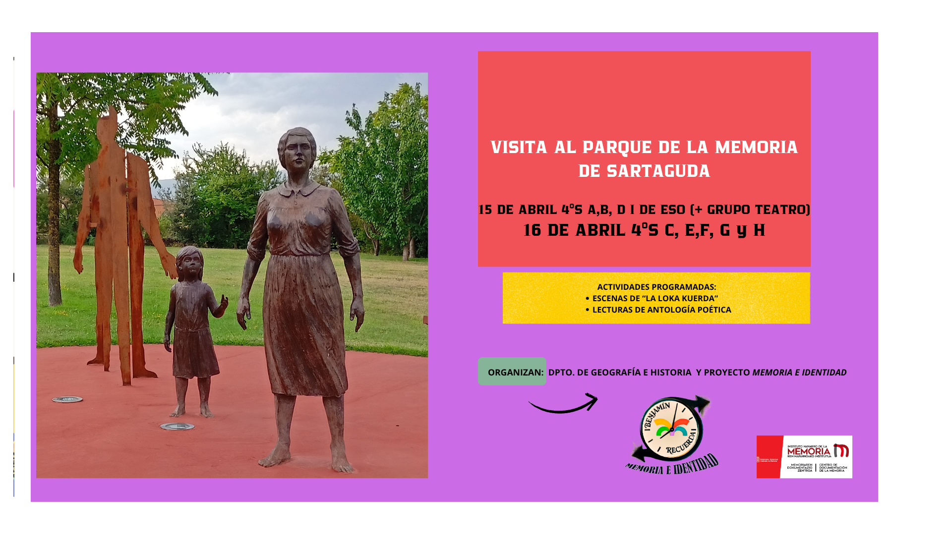 Dentro del PROGRAMA "ESCUELAS CON MEMORIA" del Instituto Navarro de la Memoria los días 15 y 16 de abril el alumnado de 4º ESO del IES Benjamín de Tudela participará en el VII ENCUENTRO INTERGENERACIONAL en el Parque de la Memoria de Sartaguda.
