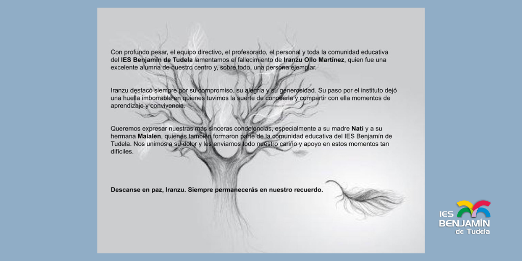 Queremos expresar nuestras más sinceras condolencias, especialmente a su madre Nati y a su hermana Maialen, quienes también formaron parte de la comunidad educativa del IES Benjamín de Tudela. Nos unimos a su dolor y les enviamos todo nuestro cariño y apoyo en estos momentos tan difíciles.